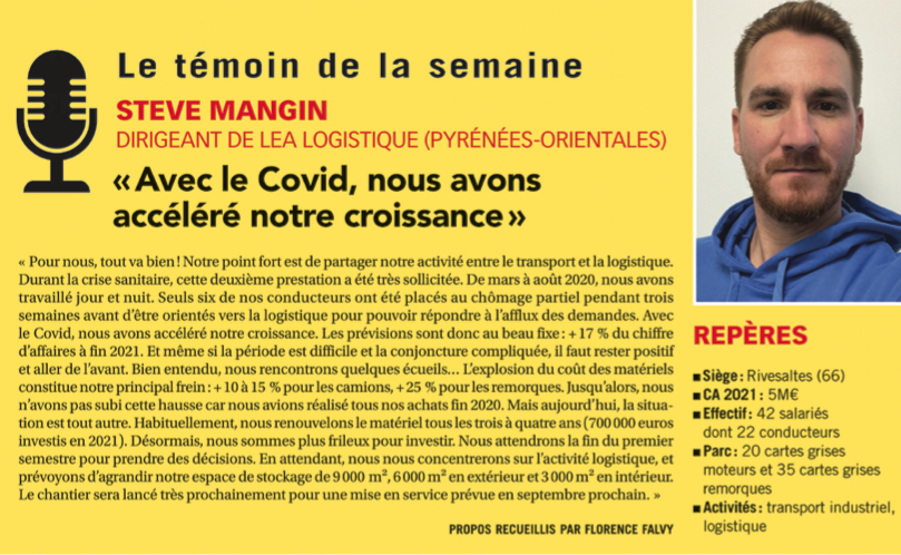 Pour Steve Mangin, dirigeant de Lea logistique, entreprise située dans les Pyrénées-Orientales, sa force est de partager son activité entre le transport et la logistique. Cette double casquette lui a permis de tenir la barre pendant la crise sanitaire. Mais échaudé, il reste prudent et reporte ses investissements.