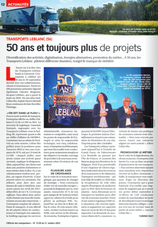 Publication dans L'Officiel des Transporteurs n°3129 du 21 octobre 2022